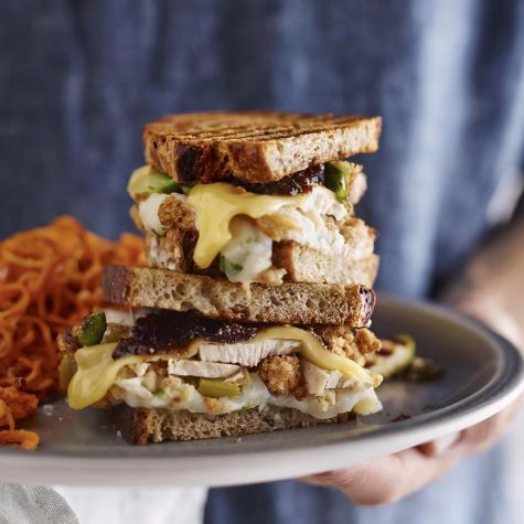 Relive Thanksgiving dinner with this impressive toasted sandwich, which contains leftover turkey and many of our favorite Thanksgiving sides. Feel free, of course, to improvise based on whatever you find in your fridge the weekend after the big celebration.