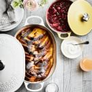 To make the French toast, butter an oval Dutch oven or a large oval baking dish. In a large bowl, whisk together the eggs, milk, cream and vanilla bean seeds. Stir in the cooled lemon curd. Arrange the bread slices evenly in the prepared baking dish, overlapping the slices slightly, and pour the egg mixture evenly over the bread. Cover and refrigerate overnight.