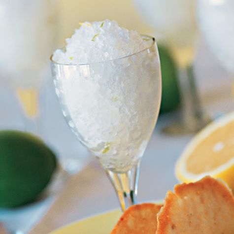 Add the lime and lemon juices and zests to the chilled sugar syrup and stir well. Pour the mixture into a 9-by-12-by-2-inch baking pan or other metal pan. Place in the freezer until ice crystals form around the edges, about 30 minutes. Remove from the freezer and, using a metal spoon, stir the ice into the center of the pan. Continue freezing and stirring the mixture every 30 minutes until frozen solid, about 2 1/2 hours total.