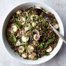 A lemon-herb vinaigrette adds bright flavor to earthy French lentils in this hearty salad from Katie Button, chef/owner of Cúrate and Nightbell restaurants in Asheville, North Carolina. The recipe for the vinaigrette makes about 1 1/2 cups dressing—considerably more than you will need to dress the salad—but Katie likes to make a large batch to avoid having leftover herbs wilting in her fridge. Just freeze the leftover dressing in 1/2-cup portions and use on your favorite salads within a few months. Or, if you prefer, you can cut the dressing recipe in half.