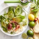 This recipe features a creative spin on classic green goddess dressing: we’ve added fresh cilantro along with chives and parsley and swapped out the traditional lemon juice for lime zest and juice. It all comes together easily in a blender. Then we drizzle the robust dressing over a spring-fresh salad of Little Gem lettuce, rainbow carrots, radishes and fava beans. Be sure to give the carrot ribbons a quick soak in ice water, which will help them to curl nicely.