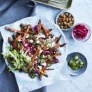 To assemble, place the romaine on a serving platter, and scatter the sweet potato fries on top, followed by the chickpeas. Sprinkle the feta, pepitas and jalapeño evenly on top, and add as many of the pickled onions as you like (you may have some left over). Dollop evenly with the sour cream, season with pepper and serve. Serves 4 to 6.