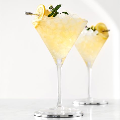 Fill the chilled glass with crushed ice. Strain the lychee mixture into the glass, garnish with the mint leaves and lemon wheel, and serve immediately. Makes 1 drink.