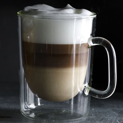 Pour the steamed milk into a clear glass. Slowly pour the espresso on top of the milk; the steamed milk should sink to the bottom while the froth will remain at the top, with a band of espresso visible between the two milk layers. Serve immediately. Makes 1 drink.