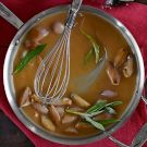 In a large sauté pan over medium heat, warm the oil. Add the shallots and cook, stirring occasionally, until browned, 10 to 15 minutes. Add the flour and cook, stirring constantly, until fragrant, about 1 minute. Slowly whisk in the stock and add the bay leaves and sage sprigs. Increase the heat to medium-high and bring to a simmer, then reduce the heat to medium-low and simmer, stirring occasionally, for 8 to 10 minutes.
