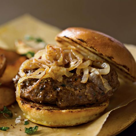 • Spiced Lamb Burgers with Caramelized Onions & Spicy Fried Potatoes (Cloves)