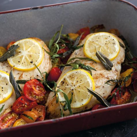 • Baked Chicken with Cherry Tomatoes, Herbs and Lemon