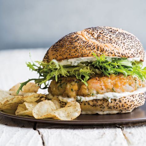 • Shrimp Burgers with Herbed Aioli and Frisee Salad