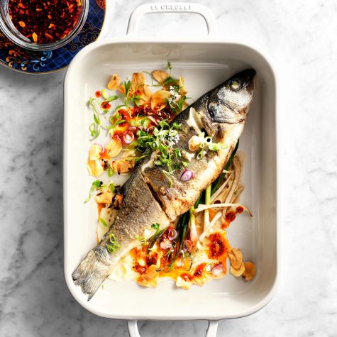 • Chinese-Style Whole Fish with Ginger & Chili Crisp