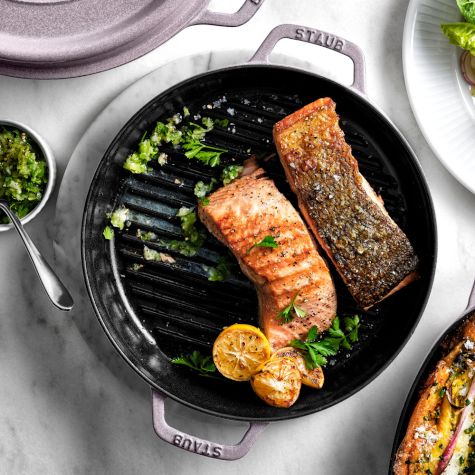 • Grilled Salmon with Lemon-and-Thyme-Scented Salsa Veracruzana