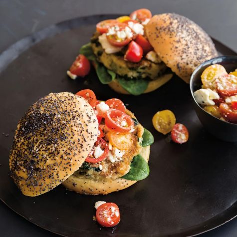 • Artichoke-Spinach Burgers with Tomato-Feta Topping