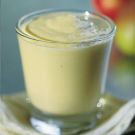 Just before serving, in a blender, combine the frozen mangoes, yogurt, milk, banana, lemon juice and vanilla. Blend until very smooth. Pour into chilled glasses and serve immediately.