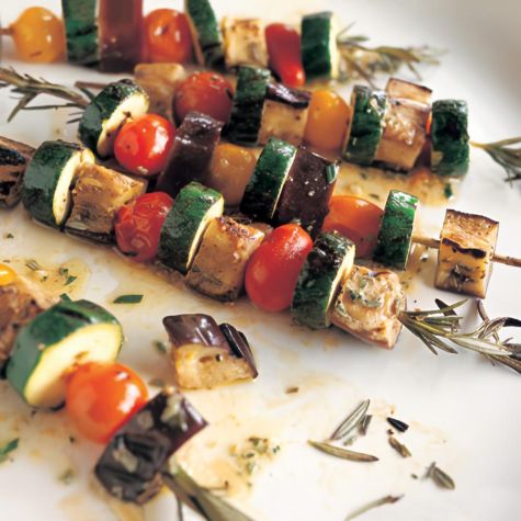 Garden-fresh summer vegetables need little to adorn them. Here, they’re marinated in a simple vinaigrette, then threaded onto sturdy rosemary stems and grilled over a hot fire. This cooking process infuses smoky-woodsy nuances into the vegetables as the herb stems smolder over the high heat of the grill.