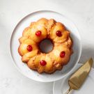 Blot the pineapple slices dry with a paper towel and arrange them in the bottom of the Bundt pan, not overlapping, but you can squeeze them together if necessary. Place a Maraschino cherry in the center of each ring.