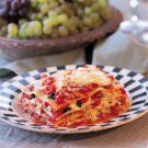 Bake until the sauce is bubbling, the top is browned and the center is heated through, about 45 minutes. (If the lasagna has come straight from the refrigerator, it will need to bake for about 1 1/4 hours.) Remove from the oven and let stand for 10 minutes. Meanwhile, reheat the remaining sauce over low heat. Cut the lasagna into squares and serve. Pass the remaining sauce and Parmigiano-Reggiano cheese at the table. Serves 8.