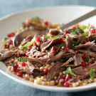 To serve, mound the couscous salad in a shallow serving bowl or platter. Top with the warm lamb, spoon some of the braising juices over the top, garnish with the mint and pomegranate seeds, and serve immediately. Serves 6.