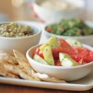 Transfer the eggplant spread, cucumber-tomato salad, hummus and tabbouleh to individual bowls and place in the center of a large platter. Arrange the pita wedges around the rim of the platter and serve. Serves 4 to 6.