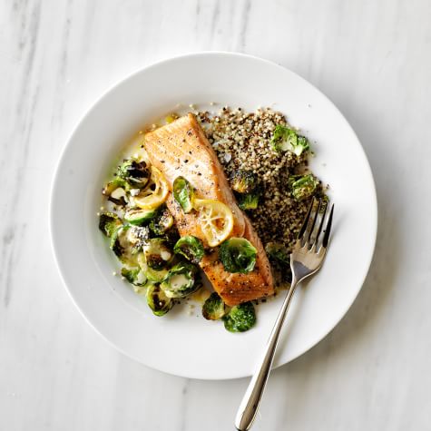 Salmon with Toasted Quinoa and Lemon-Tahini Sprouts >