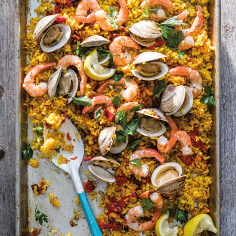Oven Paella with Chorizo, Clams and Shrimp >