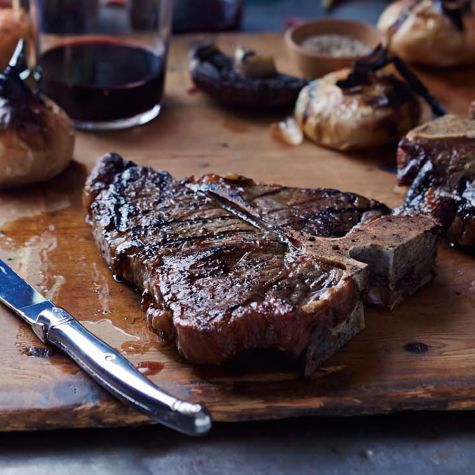 Dad will be thrilled to gather around the grill with his family to enjoy this memorable summer meal. Cocktails infused with cucumber and chile get the evening off to a spicy start, and dates wrapped in bacon are an indulgent starter. A simple yet succulent steak is served with a sauce that is best prepared a day in advance, the better to spend more time with the guest of honor, who will surely feel special when presented with a Black Forest cake for dessert.