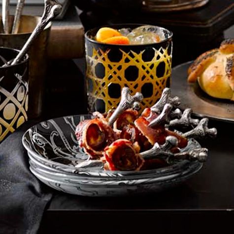 Kids aren’t the only ones who should have a devilishly delicious Halloween. After the kids finish trick-or-treating, treat yourself and your friends to a menu of decidedly adult drinks, like a hot toddy or a big bowl of sparkling blood orange punch. Quail eggs etched with an eerie spider-web pattern and decadent Devils on Horseback—sweet dates paired with salty bacon—are playful yet sophisticated snacks to accompany your cocktails before you finish the evening with a sweet autumn treat, our Ooey Gooey Pumpkin Bars.