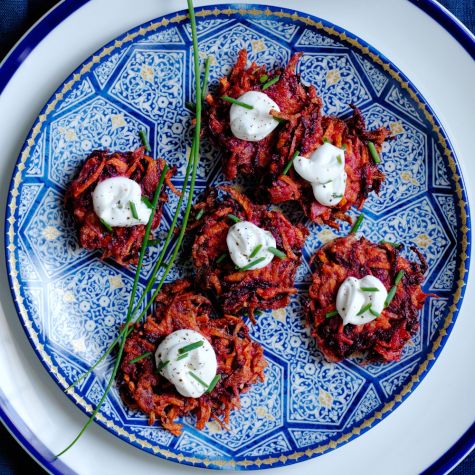 When it comes to celebrating Hanukkah, latkes are a must. It’s hard to go wrong with tradition—crisp little pancakes made from grated potato and onion that are topped with sour cream and applesauce—but we also like to mix things up by using less conventional ingredients and modern toppings. Try using beets or sweet potatoes instead of russet potatoes, or add some shredded zucchini or cauliflower to the mix. When it comes to toppings, almost anything goes. Muhammara pairs well with slivers of preserved lemon when dolloped on top of latkes, and a combo of fig jam and blue cheese make a great pairing of sweet and salty flavors. Here are a just a few ideas to get you started with your own modern latke creations.