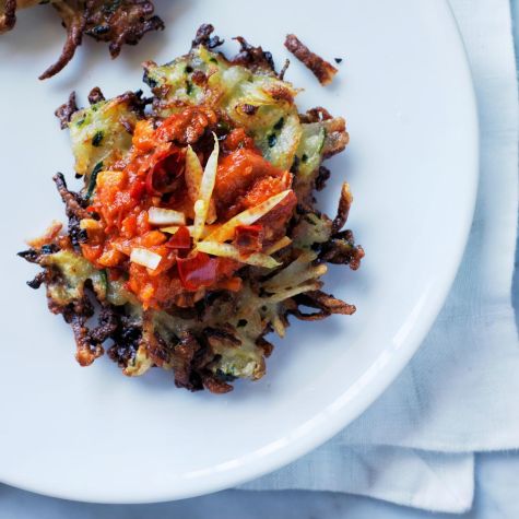 Zucchini Latkes with Muhammara and Preserved Lemon
