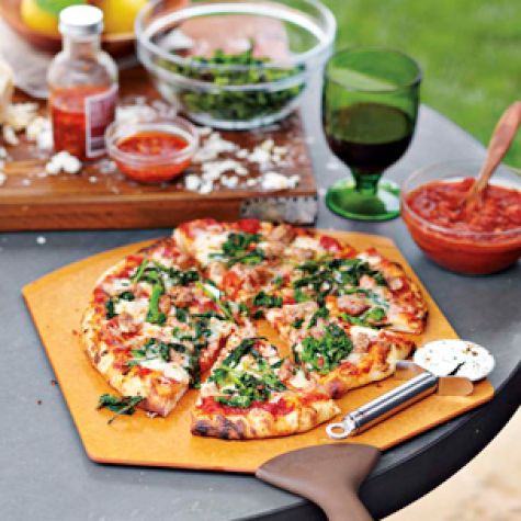 Outdoor Pizza & Wine PartyPizza takes on an entirely new character when cooked on the grill or in a pizza oven outdoors, with a slightly smoky flavor and crisp, blistered crust. Paired with robust wines on a warm evening, this party menu is satisfying and simple to pull off -- especially if you prep pizza dough and toppings the night before. Set out a simple spread of various antipasti and serve pizzas directly off the pizza peels or on wooden boards for a relaxed feel.