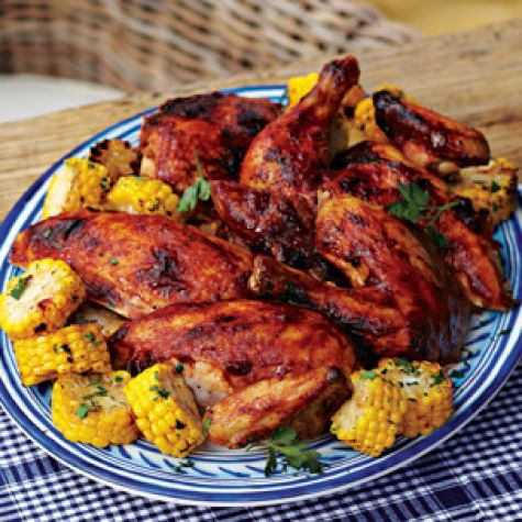 Fourth of July CookoutCelebrate the red, white and blue with this festive menu that features old-fashioned favorites plus fresh new ideas. Baby back ribs, a modern potato salad and a homey blueberry pie share the spotlight with lighter fare, including spicy grilled chicken, a refreshing zucchini salad and a summery corn succotash.