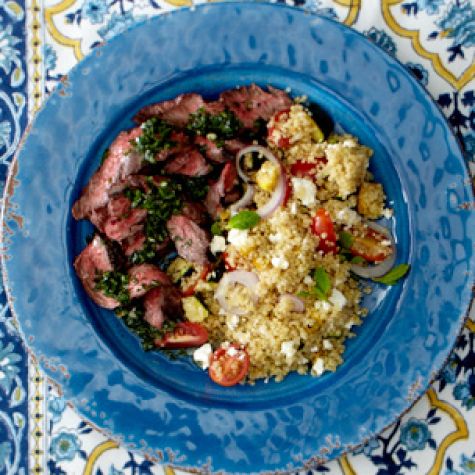 Casual Alfresco DinnerWelcome the arrival of spring by hosting a leisurely dinner with friends. Cook the food indoors, then move outside to enjoy the meal. Prep is easy: both the steak and the vegetables are cooked on a stovetop grill pan, so you don’t have to heat up your backyard grill. For an impressive ending to this springtime gathering, serve a warm galette brimming with the season’s first strawberries.