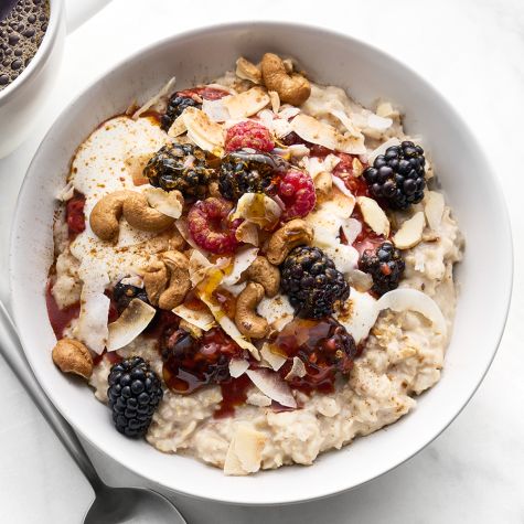 Coconut Oats with Stewed Berries, Toasted Coconut and Cashews