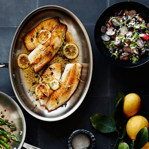 Chef-owners at Los Angeles restaurants Jon & Vinny’s, animal and Son of a Gun—the last being an homage to the fish shacks they grew up with in Florida—Jon Shook and Vinny Dotolo have a winning way when it comes to preparing seafood. Here they share their recipe for simply sautéed fluke paired with an unexpected salad of grapes. If you can’t find fluke, substitute another flaky fish such as flounder, tilapia or sole.