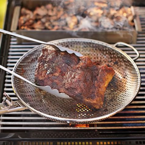 Set the fry pan on the grill over indirect heat. Cover the grill and cook for 10 minutes. Turn the ribs over, cover the grill and cook for 10 minutes more, adding additional hickory chips as needed.
