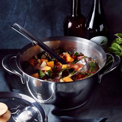 The best versions of this soup are made with fresh seasonal vegetables. Don’t hesitate to add or substitute cabbage, green beans, eggplant, cauliflower, peas, zucchini, leeks or whatever else looks good at the market. A dollop of pesto on top adds a great aroma and fresh flavor to this hearty soup. Simmering the rind from a wedge of Parmigiano-Reggiano in the soup imparts a rich, deep flavor.