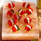 Here, a Himalayan salt plate is used as a serving vessel. As the skewers sit, the water released from the tomatoes and mozzarella pulls salt out of the plate. We found that 3 hours is optimal for the ingredients to develop a lightly salted flavor, but adjust the time as you wish, or sprinkle the skewers with a bit of sea salt just before serving.