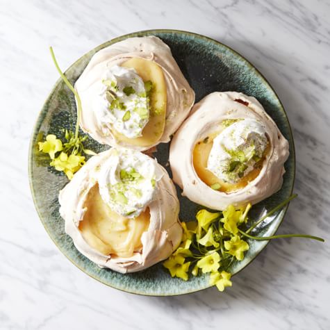 Mini Pavlovas with Lemon Curd, Whipped Cream and Shaved Pistachio