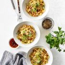This quick-cooking noodle dish features an irresistible sauce made with butter, garlic, white miso and Parmesan cheese. To finish the dish, we garnish the noodles with chili crisp, a medium-spicy condiment that includes pepper flakes, tamari, soy sauce and sweet ginger. A sprinkling of julienned scallions adds color and crunch. These noodles are part of the Test Kitchen’s Father’s Day feast, but they are also perfect to whip up for a fast weeknight dinner.