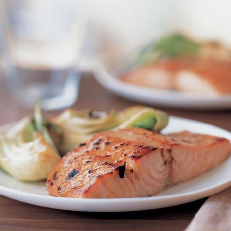 Broil until the fillets and bok choy are caramelized and lightly charred on the edges, 3 to 4 minutes. Carefully turn the fillets and bok choy over and brush with the reserved marinade. Broil until the salmon is slightly charred on the outside and just cooked through and the bok choy is crisp-tender, 3 to 4 minutes more. Divide the salmon and bok choy among 4 plates and serve immediately. Serves 4.