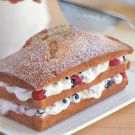 Using a large, thin-bladed serrated knife, cut the cake horizontally into 3 equal layers. Place the bottom cake layer on a serving plate and, using an icing spatula, spread with half of the whipped cream with berries. Place the middle cake layer on top of the cream and spread with the remaining half of the whipped cream. Top with the final cake layer. Refrigerate for at least 2 hours or up to 5 hours.