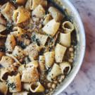 Williams Sonoma Test Kitchen cook Belle English fondly remembers eating this comforting dish made from pantry staples—her mother’s original invention—when she was a child. Paccheri, which comes in both smooth and ridged versions, is a large tubular pasta popular in southern Italy, but rigatoni, penne or ziti would work equally well.