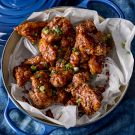 Boasting sweet and spicy flavors, the popular Japanese fried chicken known as chicken karaage makes a fantastic appetizer. This version is tossed with a spicy garlic soy sauce, developed in partnership with world-famous chef Masaharu Morimoto who is renowned for his innovative culinary style and unique fusion flavors. This recipe is easy to scale up when you’re serving a crowd and trust us, these savory, bite-size morsels will go fast! The chicken pieces are fried twice, the key to producing that irresistible, extra-crispy skin.