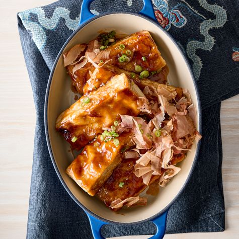 Transfer the tofu and sauce to a plate or serving dish. Garnish with the scallions and bonito flakes and serve. Serves 4.