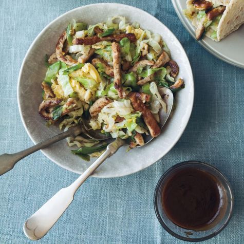 Return the pan to medium-high heat and add the remaining 1 Tbs. grapeseed oil and then the green onions, pepper flakes and the remaining 3 tsp. ginger. Stir-fry until fragrant, about 30 seconds. Add the cabbage and sprinkle with salt and black pepper. Stir to coat with the oil. Add the remaining 2 Tbs. water, cover the pan and cook until the cabbage wilts, about 2 minutes. Add the egg and pork with any juices from the plate, the remaining 1 Tbs. soy sauce and 1 tsp. sesame oil and stir-fry until heated through. Transfer to a platter or shallow bowl.