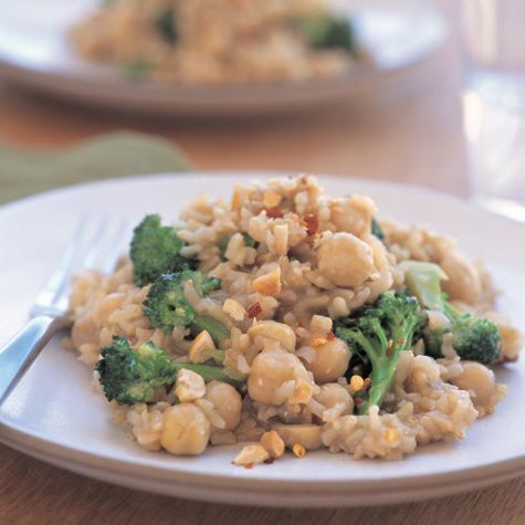 Regular long-grain or short-grain brown rice can be used in place of basmati. Check the package as the cooking time may vary. Corn kernels and green peas or chopped red bell pepper can be substituted for the broccoli and chickpeas.