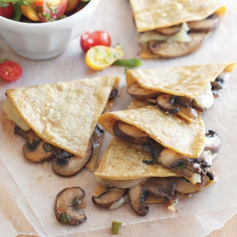 Heat a griddle or large fry pan over medium-low heat. Add 2 tortillas and cook until softened slightly, about 30 seconds. Turn the tortillas over. Spread 1/4 cup of the cheese over half of each tortilla, leaving a border around the edges. Spread 1/4 cup of the mushroom mixture over the cheese on each one. Fold the empty side of the tortillas over the filling and press lightly. Cook, turning once, until light golden and crisp, about 3 minutes per side. Transfer to warmed plates. Repeat with the remaining tortillas, cheese and mushroom mixture, adding more tortillas to the griddle after folding the quesadillas in half.