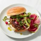 Place the burgers on buns or in large lettuce leaves. Spread the burgers with the Dijon aioli and top with the pickled onions, avocado, arugula and jalapeño. Serve immediately. Serves 6.