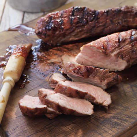 Place the tenderloins on the grill directly over the heat and cook until nicely grill-marked, 3 to 4 minutes. Roll them about one-quarter turn, brush the cooked side with some of the glaze and cook for 3 to 4 minutes more. Roll and brush again, then continue in this manner for a total of about 15 minutes for medium. If the glaze begins to burn, move the tenderloins to the edge of the charcoal grill or lower the heat of the gas grill. The pork is ready when it feels fairly firm to the touch, or an instant-read thermometer inserted into the thickest part of the meat registers 145ºF. The internal temperature of the tenderloins will rise a few degrees as they rest.