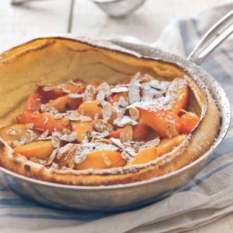 Remove the pan from the oven. Pour the nectarine mixture into the center of the pancake. Sprinkle with the almonds and dust lightly with confectioners’ sugar. Cut into wedges and serve hot, directly from the pan. Serves 4.