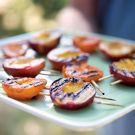 Brush the fruit on all sides with grapeseed oil. Grill the skewers directly over medium-high heat, turning once, until grill marks appear and the fruits are slightly soft, 2 to 3 minutes per side.