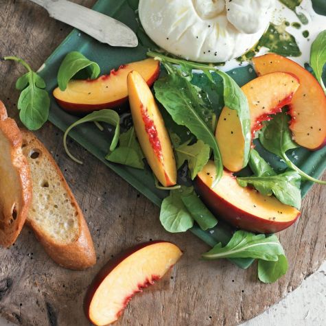 Creamy burrata cheese meets sweet nectarines in this summer-fresh starter that takes just minutes to assemble. Let guests help themselves, layering the ingredients on crusty bread.